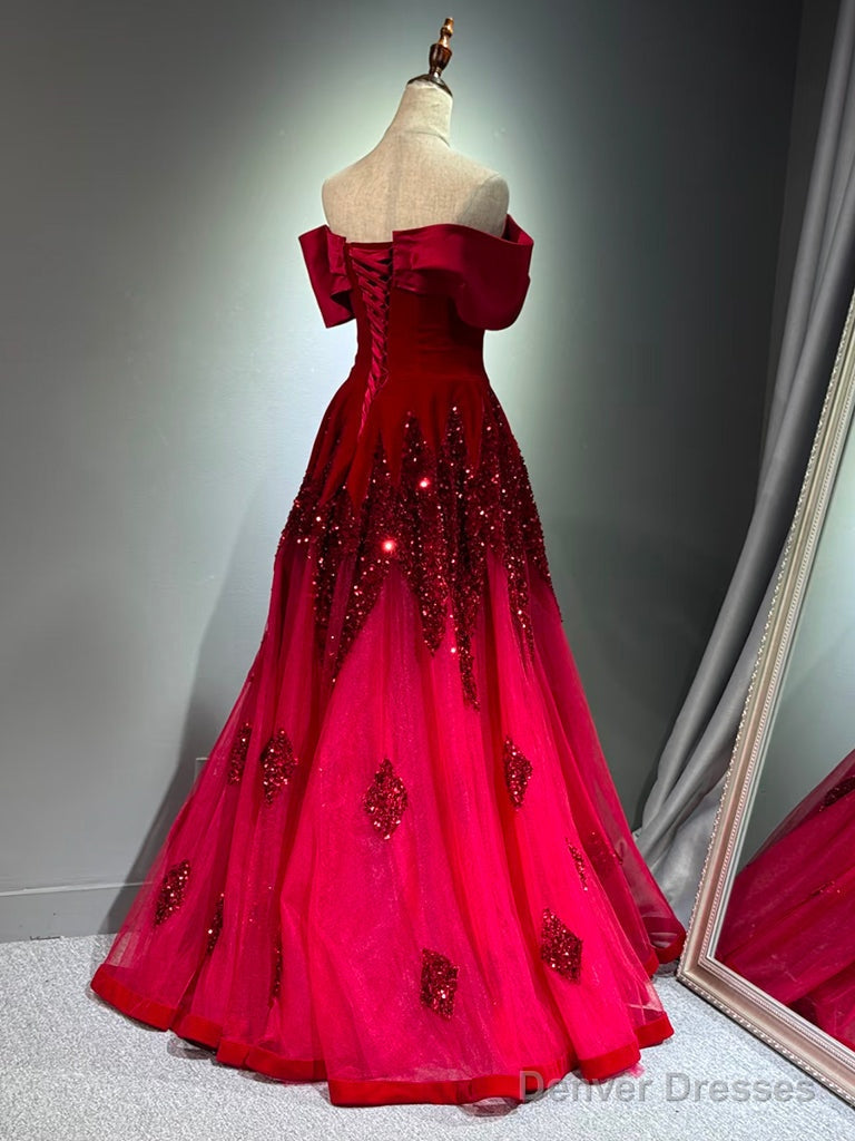 A-Line Off Shoulder Tulle Sequin Burgundy Long Prom Dress, Burgundy Formal Dress