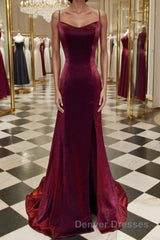 A-Line/Princess Spaghetti Straps Sweep Train Velvet Prom Dress With Leg Slit