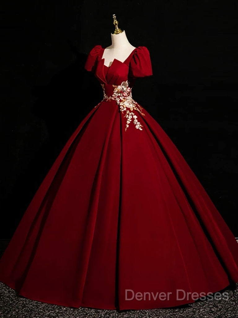 A-Line Short Sleeve Satin Lace Applique Burgundy Long Prom Dress