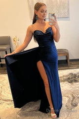 A Line Sweethaert Navy Blue Long Prom Dress with Split Front