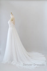 Amazing Long A-line Chapel Train Appliques Tulle Backless Wedding Dress