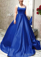 Ball Gown A-line Square Neckline Spaghetti Straps Sweep Train Satin Prom Dresses With Pleated Pockets