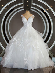 Ball-Gown V-neck Court Train Tulle Wedding Dresses with Appliques Lace