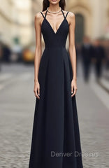 Black Chiffon Straps Long A-line Junior Prom Dress, Black Party Gowns