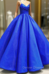 Blue Spaghetti Satin Long Formal Dress, A-Line Evening Party Gown