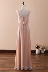 Blush Pink Spaghetti Strap Ruffled Long Bridesmaid Dress