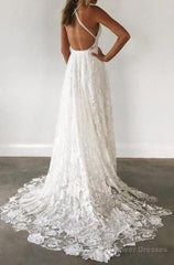 Charming Ivory Lace A Line Spaghetti Straps Backless Side Slit Beach Wedding Dresses