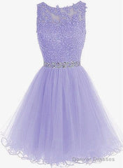 Cute Round Neck Lace Short Purple Prom Dresses, Purple Homecoming Dresses