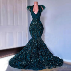 Dark Green Sequined Mermaid Prom Dresses, 2025 For African Black Girls Court Train Feather V Neck Sexy Formal Party Gowns