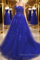Gorgeous Blue Lace Floral Long Prom Dress, Blue Appliques Formal Evening Dress, Blue Ball Gown