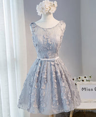 Gray Round Neck Lace Short Prom Dress, Cute Lace Homecoming Dress