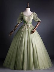 Green Tulle Square Puff Sleeve Sequins Appliques Quinceanera Dress