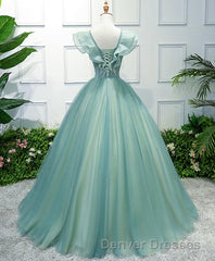 Green V Neck Tulle Long Prom Dress, Green Evening Dress