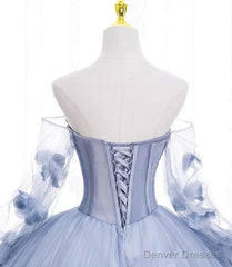 Lovely Light Blue Tulle Long Sleeves Sweet 16 Dress, Light Blue Flowers Formal Dress.