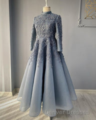 modest blue prom Dress lace emroidery evening Dress