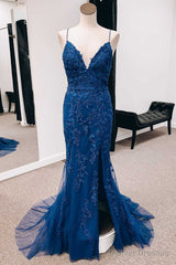 Navy Appliques Lace-Up Back Mermaid Long Formal Dress with Slit,Unique Prom Dresses