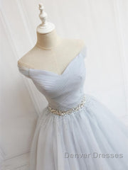 Off the Shoulder Short Gray Prom Dress with Coset Back, Short Beaded Gray Graduation Homecoming Dress