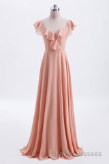 Peach Ruffles A-lline Chiffon Long Bridesmaid Dress with Tie Back