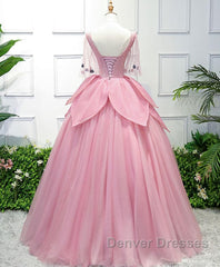 Pink V Neck Tulle Lace Applique Long Prom Dress, Pink Evening Dress, 1
