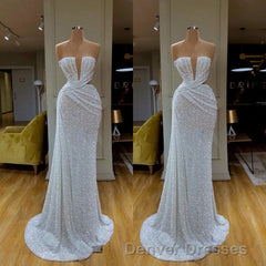 Plunging V-neck Sparkle White Sequined Strapless Prom Dress