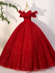Red Tulle Long A-Line Ball Gown, Red Off Shoulder Formal Dress