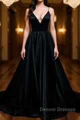 Simple A Line V Neck Black Satin Long Prom Dress, Black Formal Dress, Evening Dress 2019