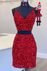 Two Piece Red Sequined Homecoming Dress, V-neck Tight Party Dress,Short Prom Dresses